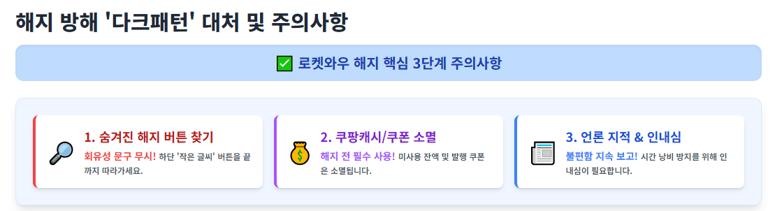 로켓와우 해지 과정은 쿠팡 회원 탈퇴 절차의 첫 관문이자, 해지를 어렵게 만드는 **'다크패턴'**이 가장 많이 적용된 구간입니다. 불필요한 금전적 손해와 시간 낭비를 막기 위해 다음 사항을 주의하세요.