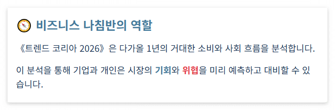 - 업무 및 일상에 적용하는 실용적인 방법은 [MZ세대 필독! 트렌드 코리아 2026 키워드 활용법 포스팅]에서 확인하실 수 있습니다.