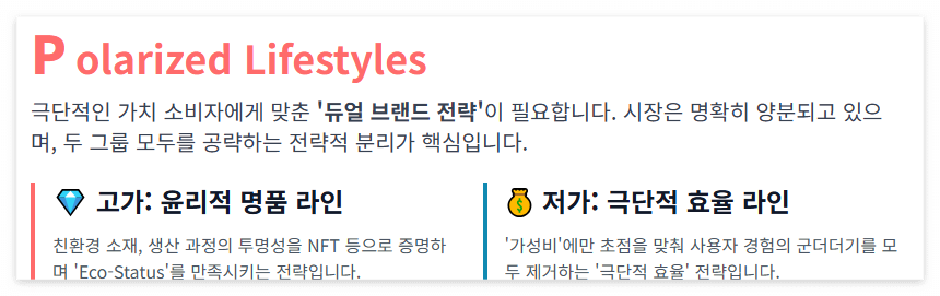 | Polarized Lifestyles | 극단적으로 양분되는 개인의 라이프스타일과 소비 패턴. | 타겟 세분화(Segmentation)의 '극대화'가 필요하다. |