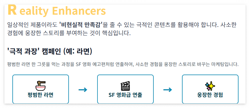 | Reality Enhancers | 현실의 부족함과 불만을 채우기 위해 경험을 과장하고 증폭시키는 행위. | 경험 디자인(XD)에서 '극적인 몰입감'을 제공하는 것이 핵심이다. |