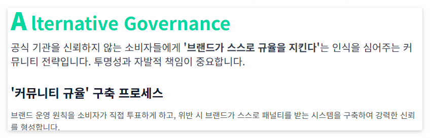 | Alternative Governance | 기존 제도와 기관에 대한 불신으로 발생하는 비공식적, 대안적 통제 시스템. | 브랜드의 투명성과 **커뮤니티 내 신뢰 구축**이 곧 시장 지배력이다. |
