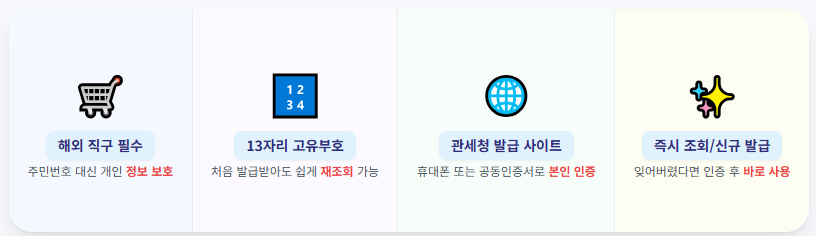 해외 직구 시 개인 정보 보호를 위해 **주민등록번호 대신** 사용하는 13자리 고유 부호입니다. 처음 발급받았더라도 잊어버렸다면 관세청 홈페이지에서 쉽게 조회할 수 있습니다.