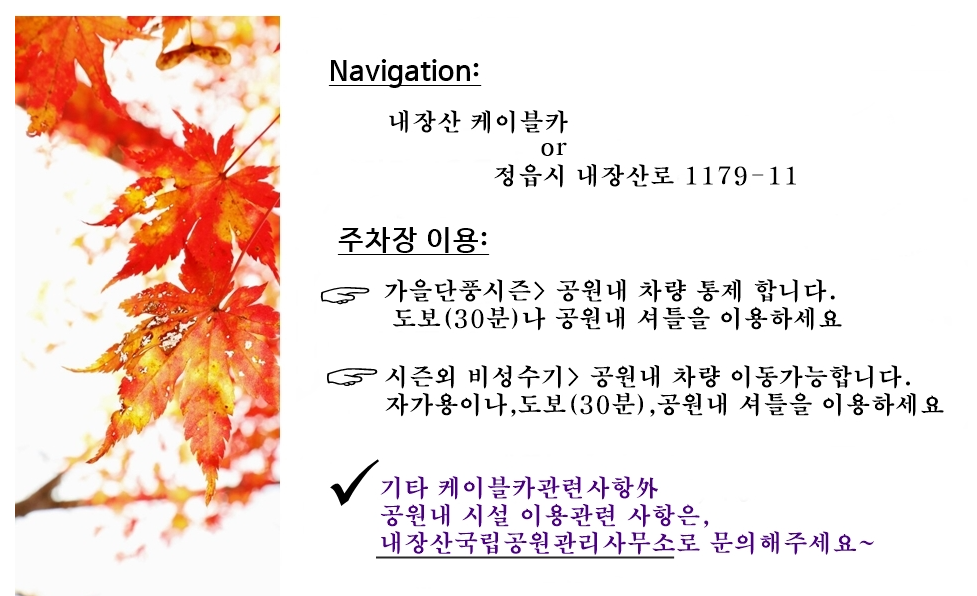 - 코스: 내장산 탐방안내소 → 내장산 케이블카 승강장 → 케이블카 탑승 → 전망대 → 서래봉 입구 (간단한 산책) → 케이블카 하산