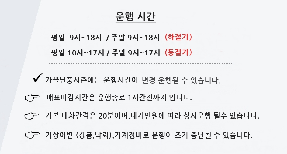 - 일반 운영 시간: 08:00 ~ 17:00 (성수기 18:00까지 연장 가능)