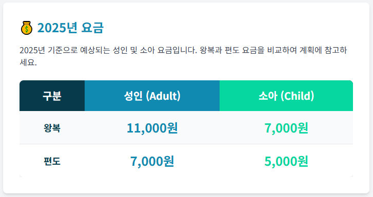 - 왕복 요금: 성인 약 11,000원, 소아 약 7,000원