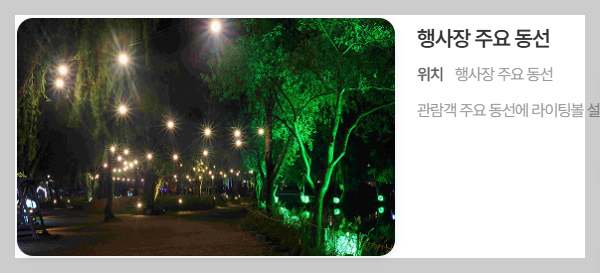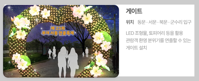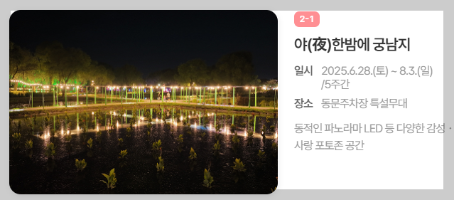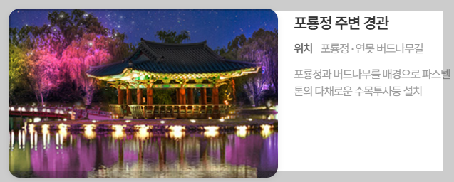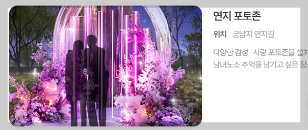 - 야(夜)한밤에 궁남지: 동적인 파노라마 LED와 다양한 감성, 사랑 포토존 공간이 조성되어 낮과는 또 다른 매력의 야경을 선사합니다.