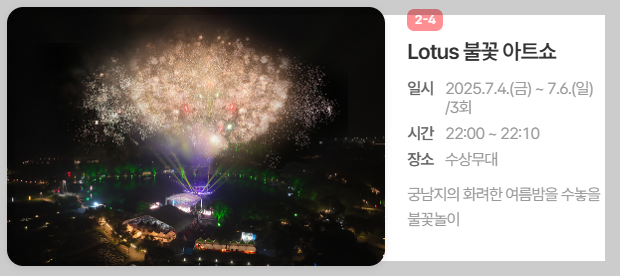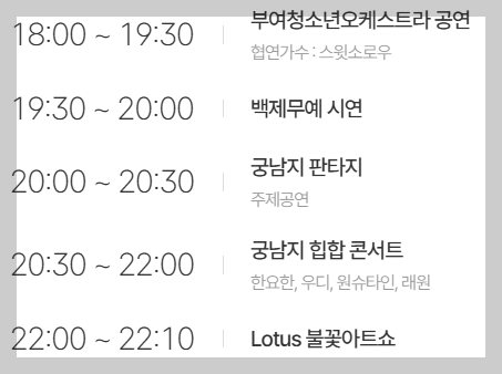 - Lotus 드론 아트쇼: 드론의 라이트와 레이저가 서동선화의 사랑과 연꽃을 형상화하며 밤하늘을 수놓습니다.
