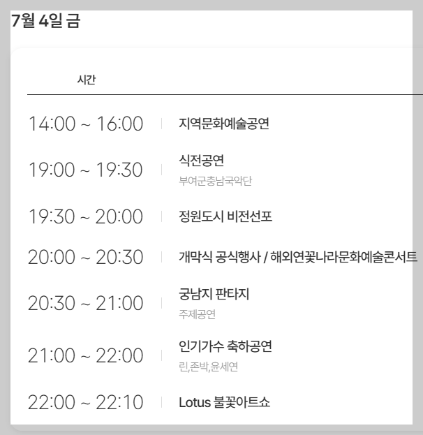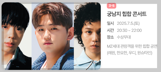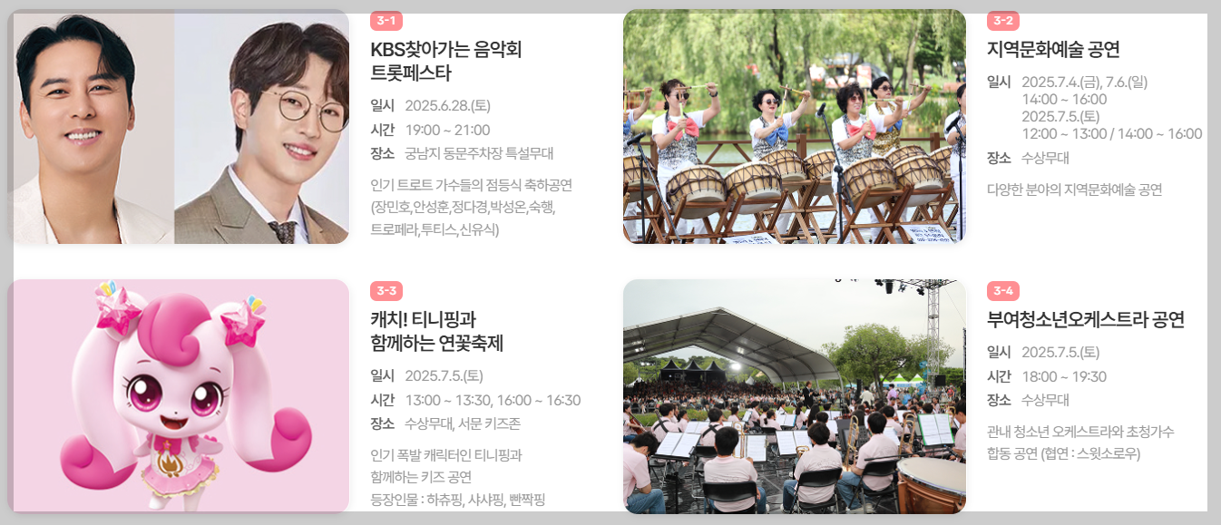 KBS 찾아가는 음악회, 궁남지 힙합 Festival, 궁남지 사랑연가 등 다양한 장르의 공연이 준비되어 있으며, 부여청소년오케스트라 공연과 핑크퐁과 함께하는 연꽃축제는 가족 단위 방문객에게 특히 인기가 많습니다. 또한, 궁남지 RPG-서동선화탐험대, 청소년 댄스경연대회, 부여 커플 노래자랑 등 참여형 경연 프로그램도 즐거움을 더합니다.