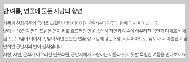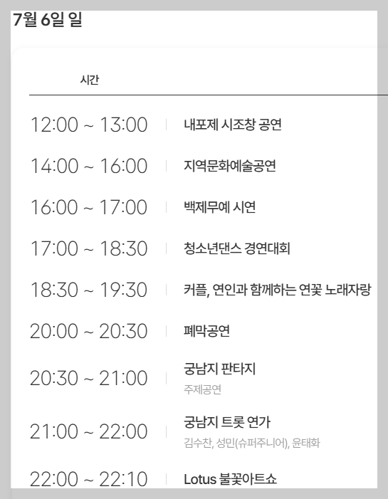 - 해외 연꽃나라 문화예술 콘서트: 연꽃을 국화로 하는 해외 예술단 초청 공연으로 국제적인 문화 교류의 장이 열립니다.