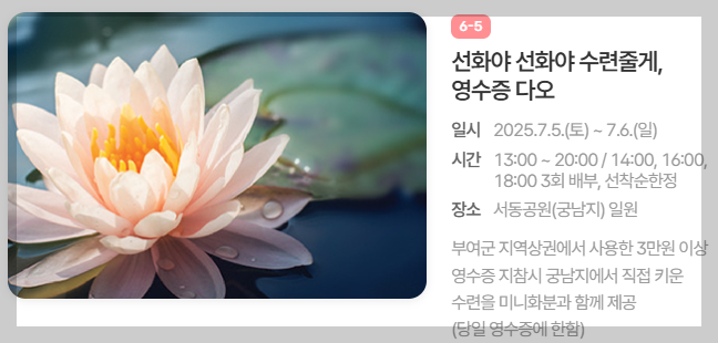 연꽃을 주제로 한 체험 프로그램이 풍성하게 운영됩니다. 연꽃 비누 만들기, 연잎 차 시음, 연꽃 캘리그라피 등 직접 참여하며 연꽃의 매력을 느낄 수 있습니다. 연지 카누 탐험, 부여 농산물 체험, 서동선화 케이크 빙수 만들기, 한여름의 연꽃 체험 등 이색적인 체험도 마련되어 있습니다. 웰컴 투 연꽃정원, 연꽃정원 피아노 쉼터, 연꽃 해설사와 함께하는 연꽃 여행, 연꽃 포토부스 등 다양한 이벤트도 놓치지 마세요.