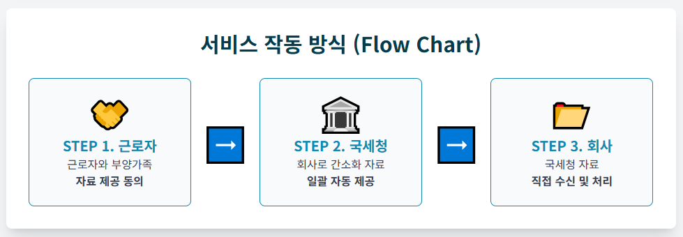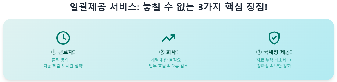 - **③ 정확성 및 보안 강화:** 국세청이 직접 회사에 자료를 제공함으로써 자료의 누락이나 오류 가능성이 현저히 줄어듭니다. 또한, 근로자의 민감한 개인 정보가 불필요하게 여러 단계를 거치지 않아 보안성 측면에서도 훨씬 안전합니다. 안심하고 맡길 수 있는 시스템인 셈입니다.