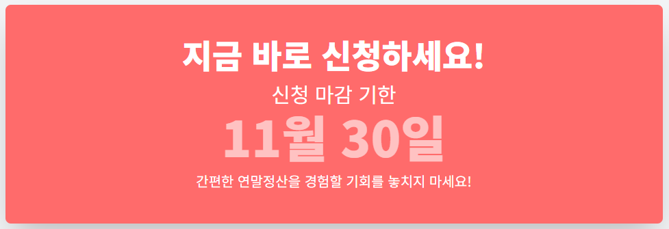 이는 바쁜 직장인의 서류 작업 부담을 대폭 줄여주고, 회사 역시 연말정산 업무를 더욱 효율적으로 처리할 수 있게 돕습니다. 11월 30일까지 신청 가능한 이 기회를 놓치지 마시고, 간편한 연말정산을 경험해 보세요.