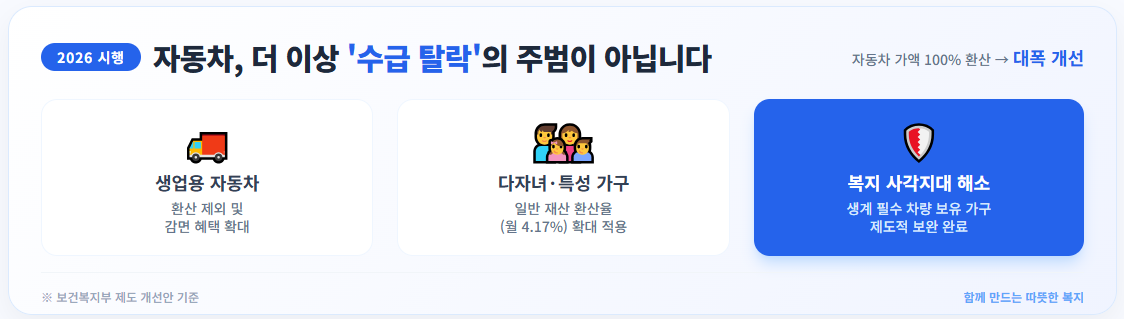 기존에는 자동차 가액의 100%를 월 소득으로 환산하는 엄격한 기준 때문에 생계가 어려워도 차량을 보유하면 수급자가 되기 어려웠습니다. 하지만 2026년부터는 **자동차 소득환산율이 대폭 개선**됩니다.