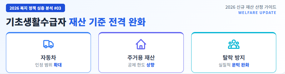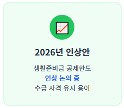금융재산(예적금, 보험 등)은 생활준비금 공제(가구당 500만 원 등)를 거친 후 소득으로 환산됩니다. 2026년에는 이 생활준비금 공제 한도 역시 인상 논의가 포함되어 있어 저축액이 조금 있더라도 수급 자격을 유지하기 수월해졌습니다.