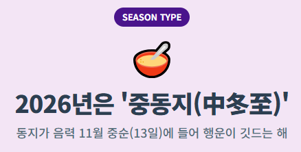 2026년은 중순인 14일에 동지가 들기 때문에 중동지의 전통을 따릅니다. 따라서 가계의 상황에 맞춰 따뜻한 팥죽 한 그릇으로 액운을 물리치기에 아주 적절한 해라고 볼 수 있습니다.