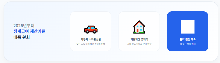 생계급여 탈락의 가장 큰 원인인 **'재산 기준'**이 2026년부터 크게 완화됩니다.
