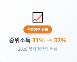 지난 900번 글에서 살펴본 것처럼, 2026년 복지 정책의 핵심은 **'선정 기준의 파격적 상향'**에 있습니다. 생계급여 선정 기준이 중위소득의 31%에서 32%로 높아짐에 따라, 기존에 아쉽게 탈락했던 저소득층 약 4만 가구가 새롭게 지원 대상에 포함됩니다.