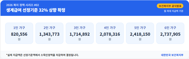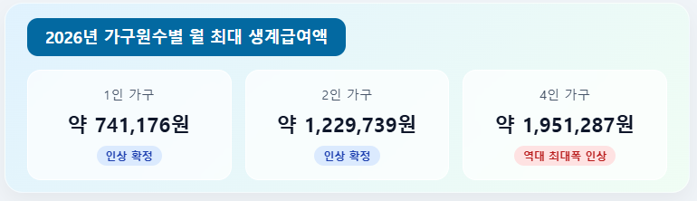 2. 2026년 가구원수별 월 최대 생계급여액