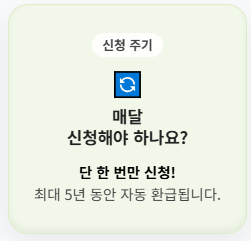 A: 아닙니다! 한 번만 신청해 두면 가입 기간(최대 5년) 동안 자동으로 보험료 납부 확인 후 환급됩니다.