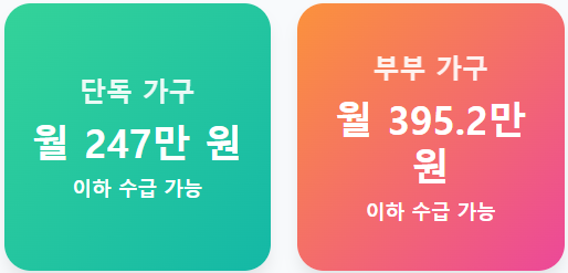 - ✅ 단독 가구: 월 소득인정액 247만 원 이하