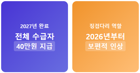 전체 수급자 40만 원 지급은 2027년 완료를 목표로 하고 있으며, 2026년에는 그 징검다리 역할을 하는 보편적 인상이 진행됩니다. 이러한 변화에 발맞춰 1961년생 신규 대상자분들은 신청 시기를 절대 놓쳐서는 안 됩니다.