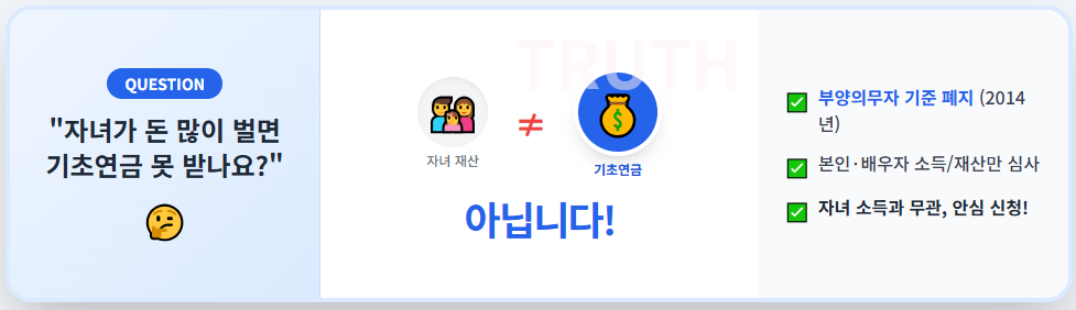 - ✅ 진실: 아닙니다. 기초연금은 자녀의 소득이나 재산과는 무관합니다.