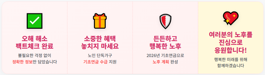 지금까지 2026년 노인 단독가구 기초연금과 관련하여 많은 분들이 궁금해하고 오해하는 점들을 팩트체크해 보았습니다.