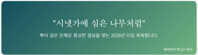 "시냇가에 심은 나무가 시절을 좇아 과실을 맺듯, 당신의 2026년도 풍성한 열매와 기쁨이 넘쳐나길 축복합니다. 새해 복 많이 받으세요."