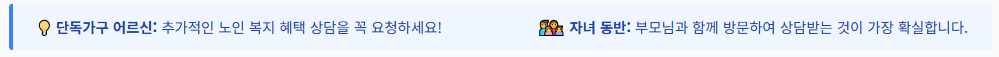 **꿀팁:** **단독가구 어르신**은 보건소나 주민센터의 담당 직원에게 건강생활실천지원금 외에 받을 수 있는 다른 노인 복지 혜택에 대해서도 함께 상담을 요청해 보세요. **자녀와 함께 거주하는 어르신**의 경우, 자녀가 부모님을 모시고 함께 방문하여 상세한 상담을 받는 것이 가장 확실합니다.