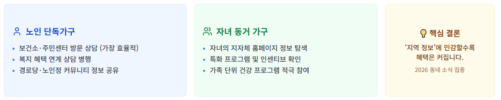 ⭐ 2026년 노인 복지 혜택 종합 가이드 보러 가기 ⭐5. 단독/동거 가구별 지역 혜택 활용 전략 (2026년)