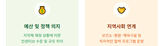 - 지자체 예산 및 정책 의지: 지자체의 재정 상황과 주민 건강 증진에 대한 정책적 의지에 따라 프로그램의 규모, 다양성, 그리고 지급되는 인센티브의 수준이 달라질 수 있습니다.