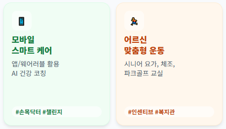 - 내용: 스마트폰 앱(만보기, 운동 기록 앱)이나 웨어러블 기기(스마트 밴드 등)를 활용한 건강 챌린지, AI 건강 코칭 서비스 제공.