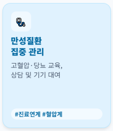 - 내용: 고혈압, 당뇨, 고지혈증 등 지역 내 어르신들의 주요 만성질환을 집중 관리하기 위한 교육, 상담, 진료 연계 프로그램. 특정 보건소는 혈압계 대여, 혈당 측정기 제공 등도 할 수 있습니다.