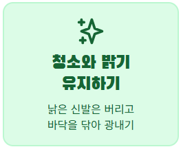 - 현관 바닥 청소: 낡은 신발은 정리하고 바닥을 깨끗이 닦아 밝은 기운을 유지하세요.