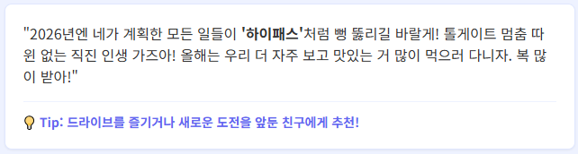 "2026년엔 네가 계획한 모든 일들이 '하이패스'처럼 뻥 뚫리길 바랄게! 올해는 우리 더 자주 보고 맛있는 거 많이 먹으러 다니자. 복 많이 받아!"
