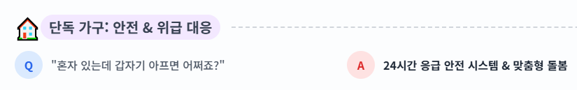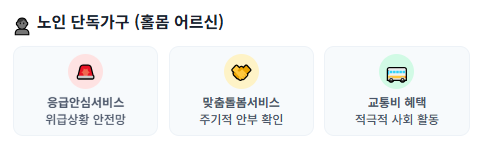 - 노인 단독가구: 홀로 생활하시기 때문에 응급 상황이나 돌봄 공백에 대한 우려가 큽니다. 교통비 지원을 통한 외출 활성화, 맞춤 돌봄 서비스, 응급 안전 시스템이 삶의 안전망이 됩니다.