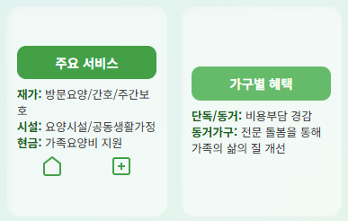 - 노인 단독/동거가구 모두: 신체 기능 저하 또는 노인성 질환으로 인해 장기적인 돌봄이 필요한 경우, 국가의 지원을 받아 비용 부담을 크게 줄일 수 있습니다.