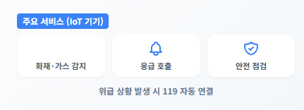 - 댁내에 화재 감지 센서, 가스 감지 센서, 응급 호출기(응급 버튼) 등 IoT(사물인터넷) 기기 설치.