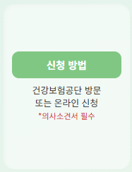 - 신청 방법: 국민건강보험공단 노인장기요양보험 운영센터 방문 또는 온라인 신청. 의사소견서 제출 필요.