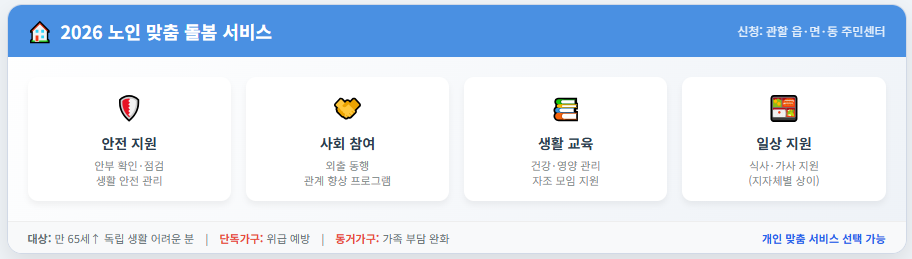 3. 든든한 일상 지원! 노인 맞춤 돌봄 서비스 (단독/동거 가구별 활용법, 2026년 기준)