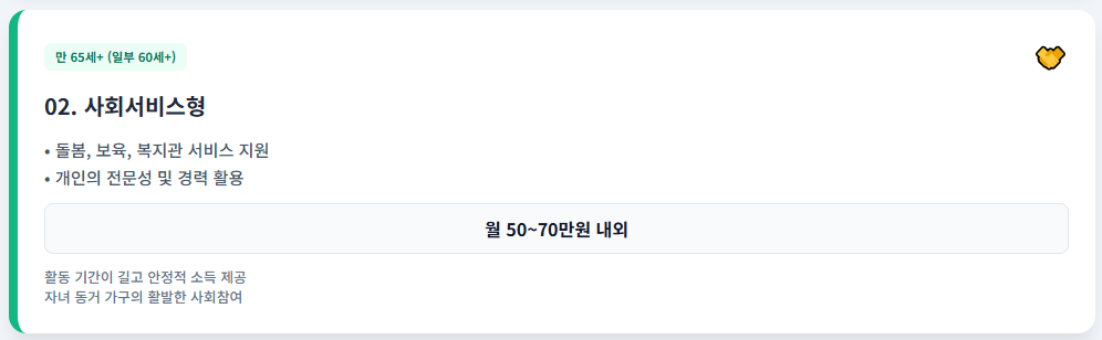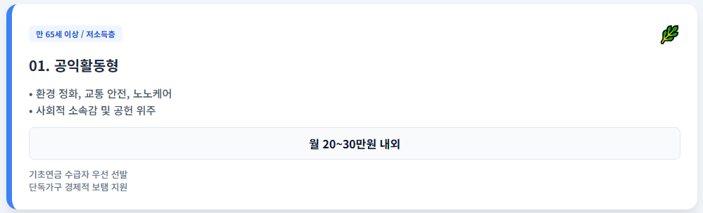 - 특징: 공익형보다 활동 기간이 길고 활동비 높음 (월 50~70만원 내외).