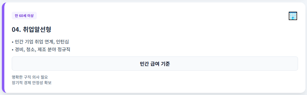 - 내용: 고령자를 고용하려는 기업에 취업을 연계하거나, 인턴 과정을 거쳐 정규직 전환 기회 제공 (경비, 청소, 제조 등 민간 분야).