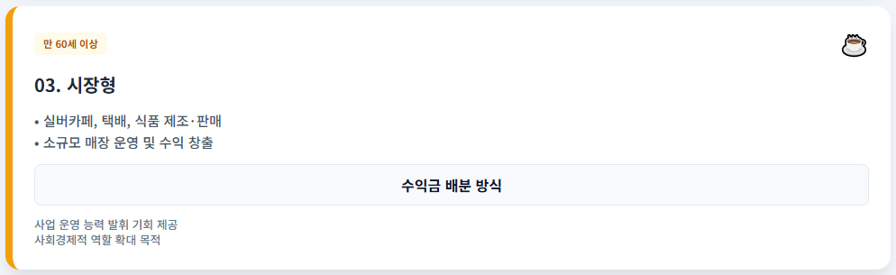 - 대상: 만 60세 이상, 일정 정도의 사업 운영 능력 필요.