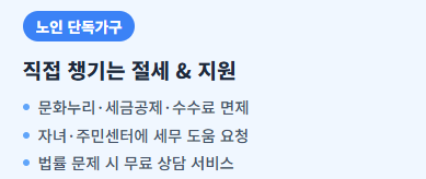 - 노인 단독가구: 혼자서 생활비를 감당해야 하는 만큼, 문화생활비, 세금 부담, 금융 수수료 등 작은 지출이라도 줄일 수 있는 혜택들을 꼼꼼히 챙기는 것이 실질적인 도움으로 이어집니다.