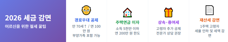 모르면 손해 보는 세금 혜택! 2026년에도 어르신들에게 적용되는 다양한 세금 감면 및 공제 제도를 활용하여 생활비를 절약할 수 있습니다.