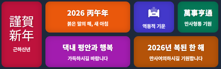 " 謹賀新年 (근하신년) - 2026년 병오년의 새 아침이 밝았습니다. 붉은 말의 역동적인 기운을 받아 올 한 해 만사형통하시고, 댁내에 두루 평안과 행복이 가득하시길 기원합니다."품격 있는 설날 인사말 문구
