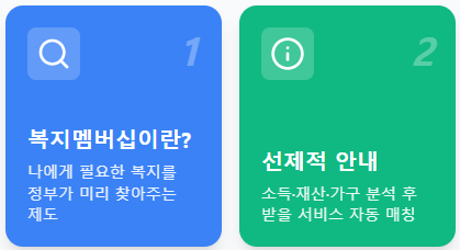 복지멤버십은 내가 어떤 복지 서비스를 받을 수 있는지 일일이 찾아볼 필요 없이, 정부가 개인의 소득·재산·가구 구성원을 분석하여 받을 가능성이 있는 복지 서비스를 선제적으로 안내해 주는 제도입니다.