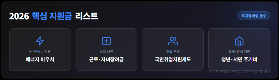 ※ 본 정보는 보건복지부 복지로 시스템을 기반으로 작성되었습니다. 복지멤버십 가입 후에도 각 개별 사업의 신청 요건을 충족해야 혜택을 받을 수 있습니다.