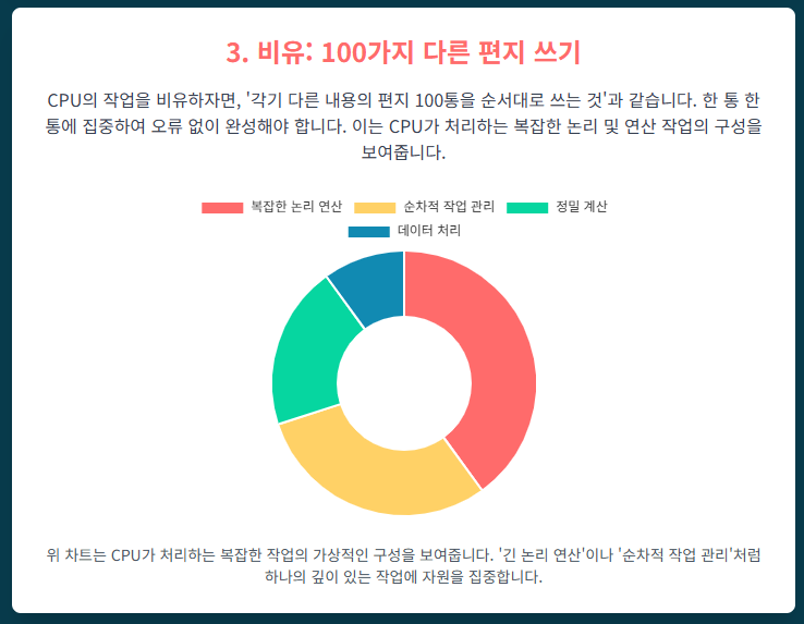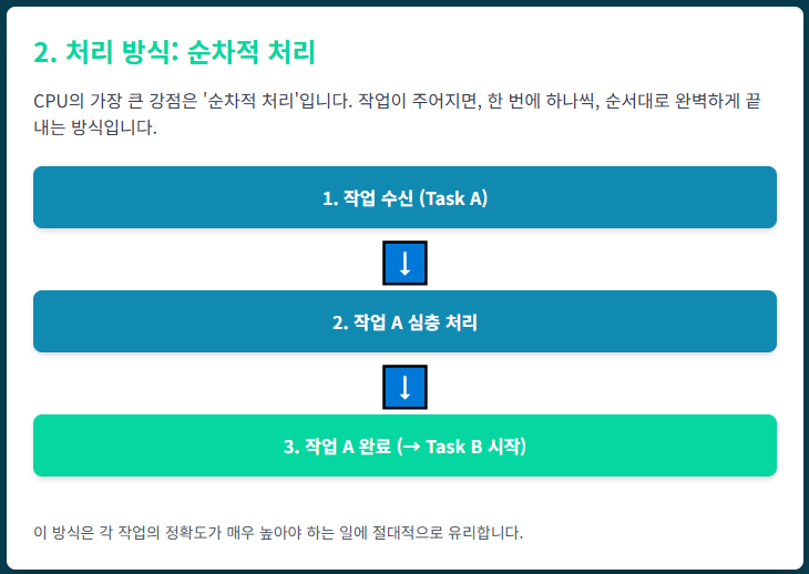 [비유] CPU는 **100개의 다른 종류의 편지**를 각각 다른 내용으로 써서 보내는 일을 합니다. 이 일은 순서(순차)가 중요하며, 반장(CPU) 혼자 차분히 하는 것이 가장 정확하고 오류가 적습니다.