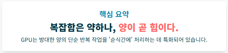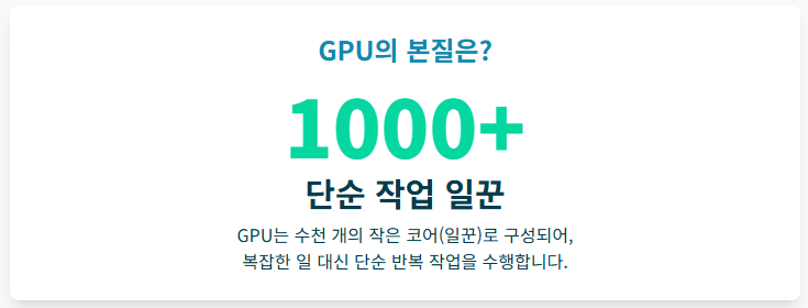 GPU 안에는 수천 개의 작은 코어(일꾼)가 들어있어, 복잡한 문제 해결 능력은 떨어지지만 **아주 단순하고 반복적인 일**을 동시에, 한꺼번에 붙어 처리하는 능력에서 CPU를 압도합니다.